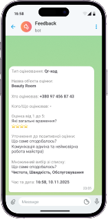 Отримуйте сповіщення про нові та негативні відгуки: в особистому кабінеті, на ваш номер телефону або в телеграм боті. Так ви одразу бачите свої сильні сторони та можете швидко реагувати на будь-які проблеми.